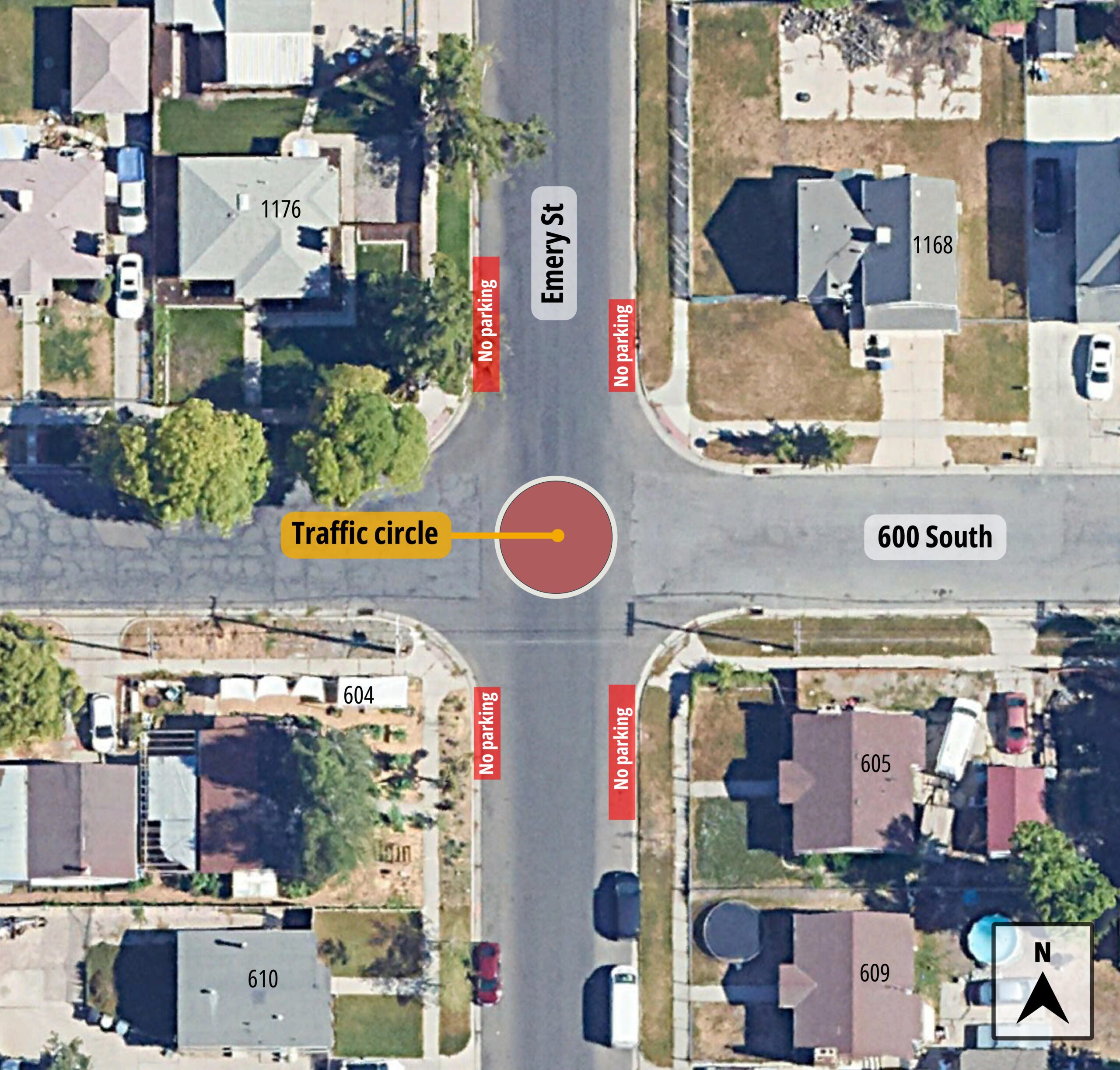- A traffic circle and all-way yield at the intersection of 600 South and Emery Street
