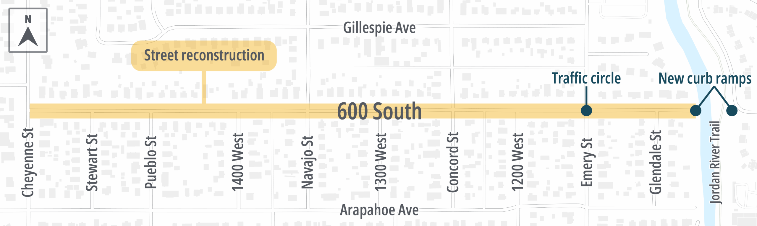 Salt Lake City is rebuilding 600 South from Cheyenne Street to the Jordan River Trail to replace worn pavement. While the street is being rebuilt, safety and accessibility improvements will also be added to increase comfort and help calm traffic. Construction is expected to begin in late spring 2026.