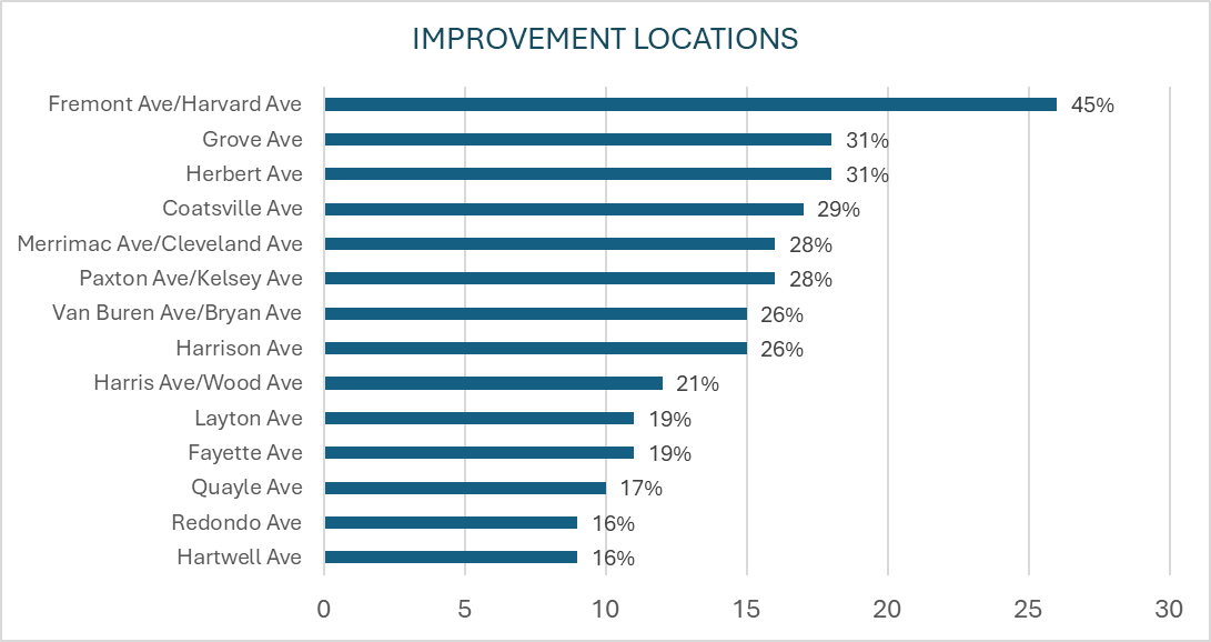 Several locations ranked highly for improvements, with the top location being Fremont/Harvard Ave. This location, along with several other highly ranked options are on a Safe Route to School and/or align with a crossing on State Street. Respondents could select up to five locations. For a visualization of votes, see the map below: