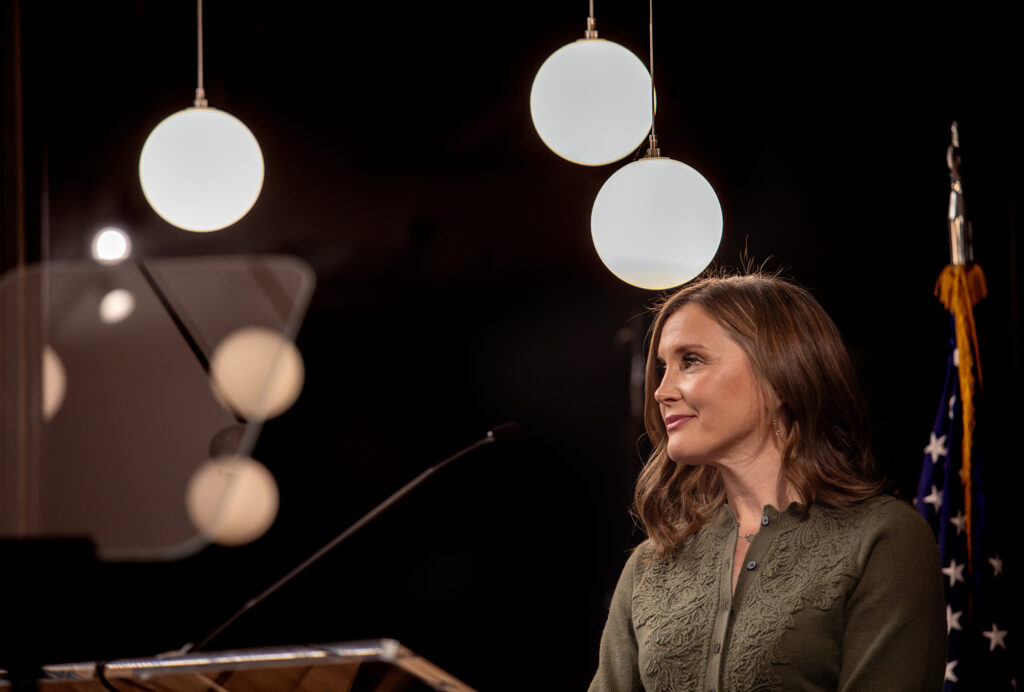Salt Lake City Mayor Erin Mendenhall answers questions at a microphone in front of the Olympic flag in the atrium of City Hall. Behind her stand Utah Senate President Stuart Adams, left, and Utah Governor Spencer Cox, right.