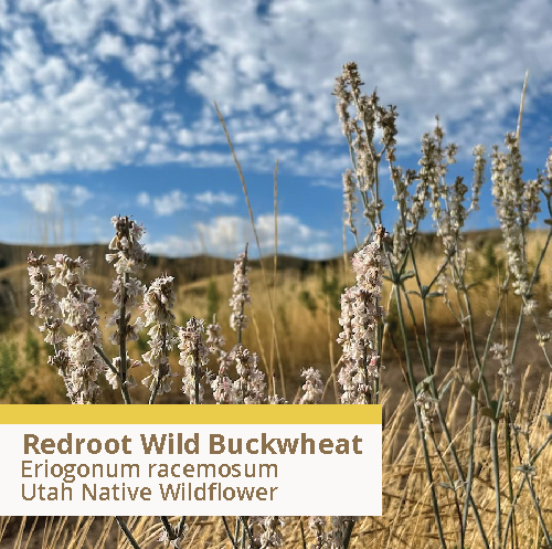 Redroot Wild Buckwheat is identified by its clusters of white-to-pink flowers and is found in foothills and dry mountain meadows. Look closely at its blooms and note the rich color hiding in the tiny flower petals. Flower stems are leafless, leaves grow close to the ground and are silvery to grey-green in color.