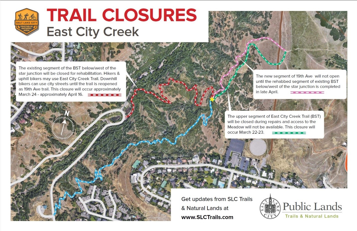 - Trail traffic headed east on the BST should remain on the BST and not turn left onto the West City Creek section of trail.
