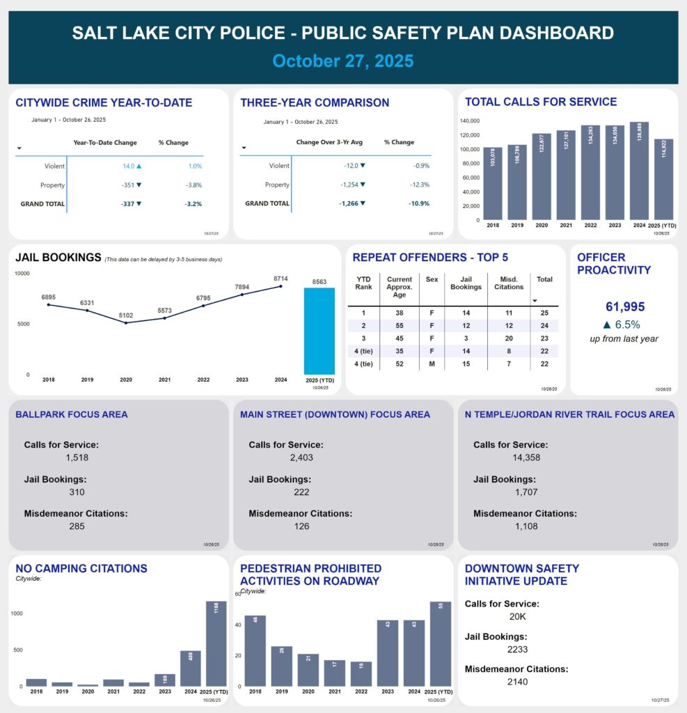 Enforcement of public order offenses is a priority for the City. Under Chief Brian Redd’s leadership, the SLCPD has already emphasized the importance of addressing these offenses. As new initiatives are rolled out, these priorities will be reaffirmed through the SLCPD’s hotspot policing strategy focused on violent crime and the implementation of the new CONNECT List, which identifies individuals with repeated system contact for more coordinated intervention and accountability.