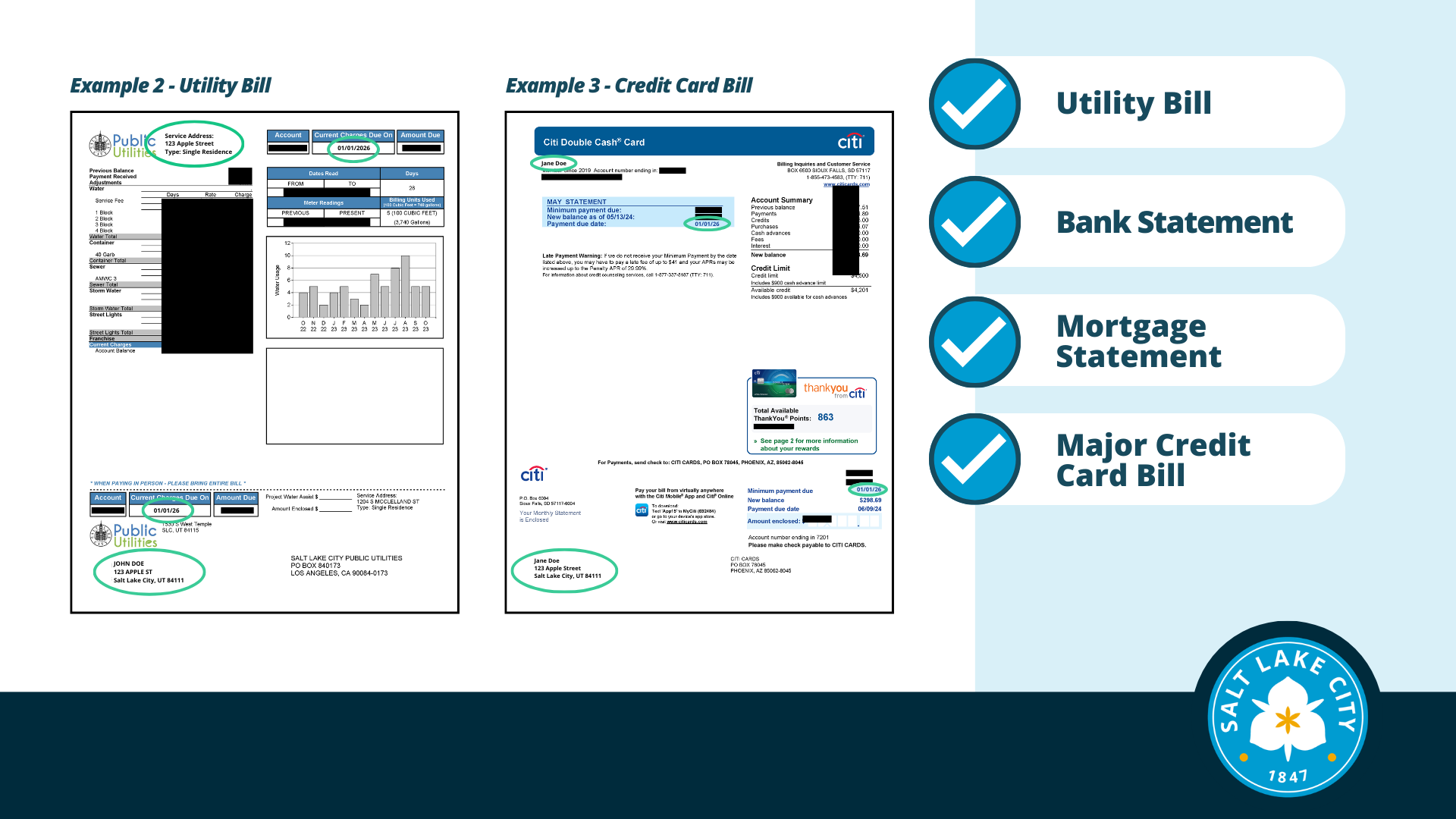 - Please redact any sensitive information. We only need to verify your name, address, and date of the document.
