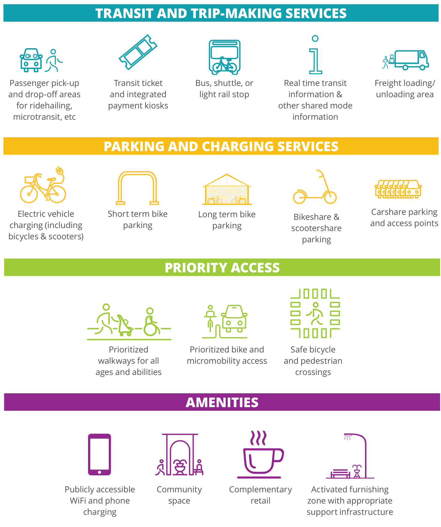 In practice, mobility hubs are the sum of their parts. The services and amenities commonly considered in mobility hub planning include the following:
