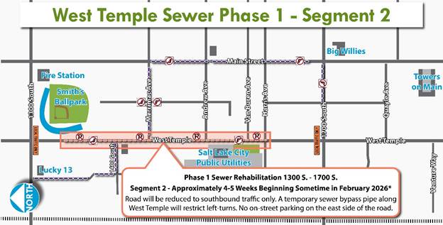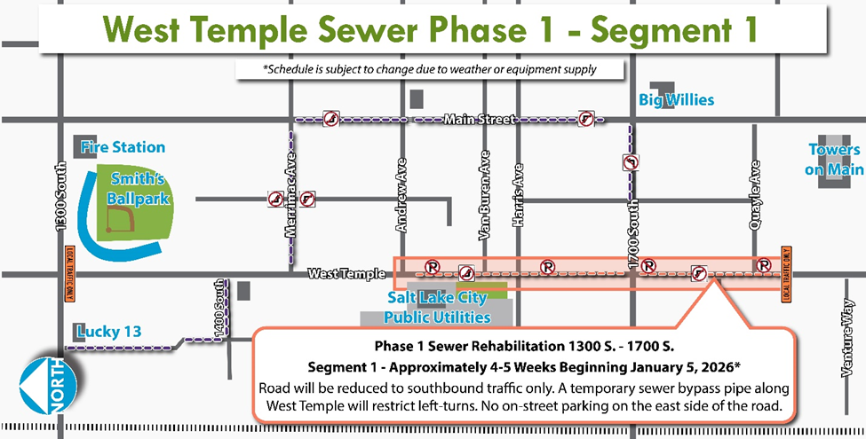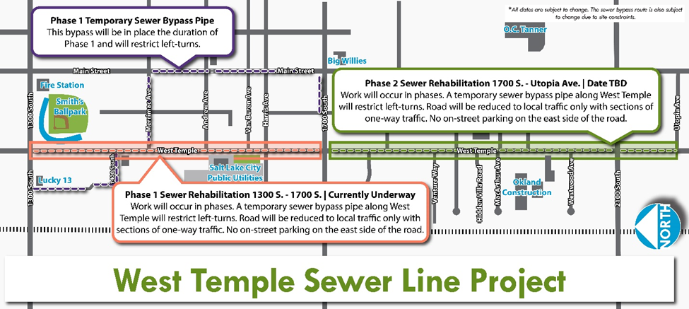 - A temporary sewer bypass pipe will be in place during Phase 1 along West Temple, Main Street, 1700 South, Merrimac Avenue, 1400 South and Jefferson Street