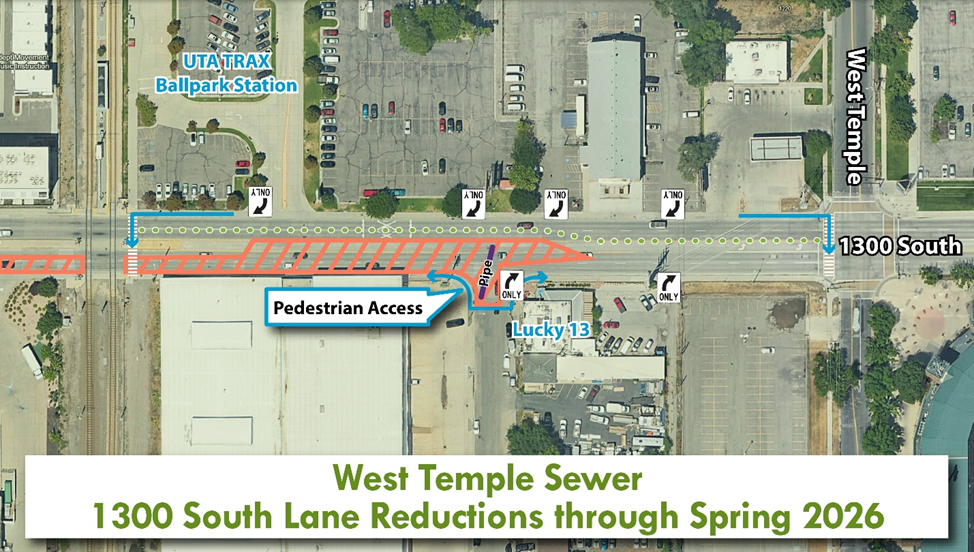 - Traffic on 1300 South from the TRAX line to West Temple will be reduced to one lane in each direction